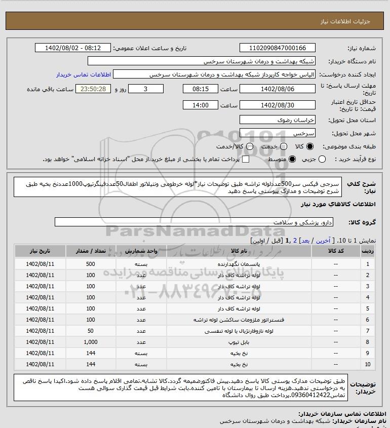 | 1 | -- | پانسمان نگهدارنده | بسته | 500 | 1402/08/11 |