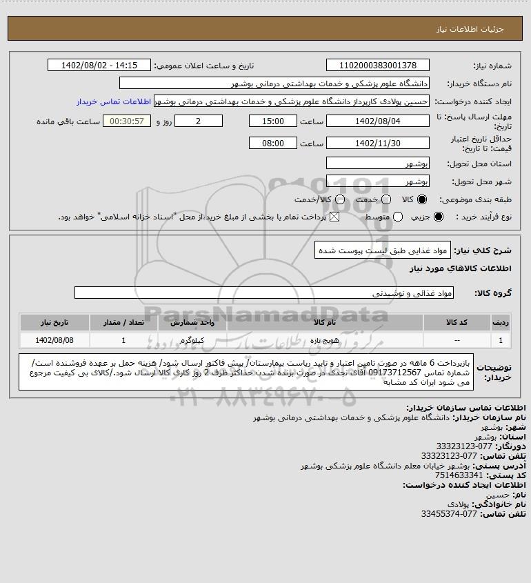 شرح کلی نیاز: مواد غذایی طبق لیست پیوست شده