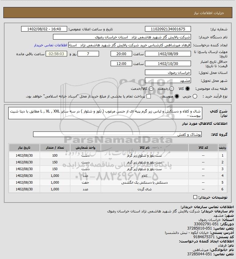| 6 | -- | شال گردن | عدد | 1,000 | 1402/08/30 |