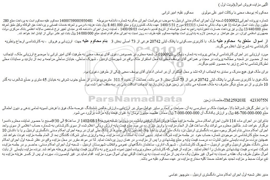 از اموال متعلق به محکوم علیه ملک با کاربری مسکونی با پلاک ثبتی 20742 فرعی از 73 اصلی بخش 3 بنام محکوم علیه جهت ارزیابی و فروش ، به کارشناسی ارجاع ونظریه کارشناسی به شرح ذیل اعلام می گردد.