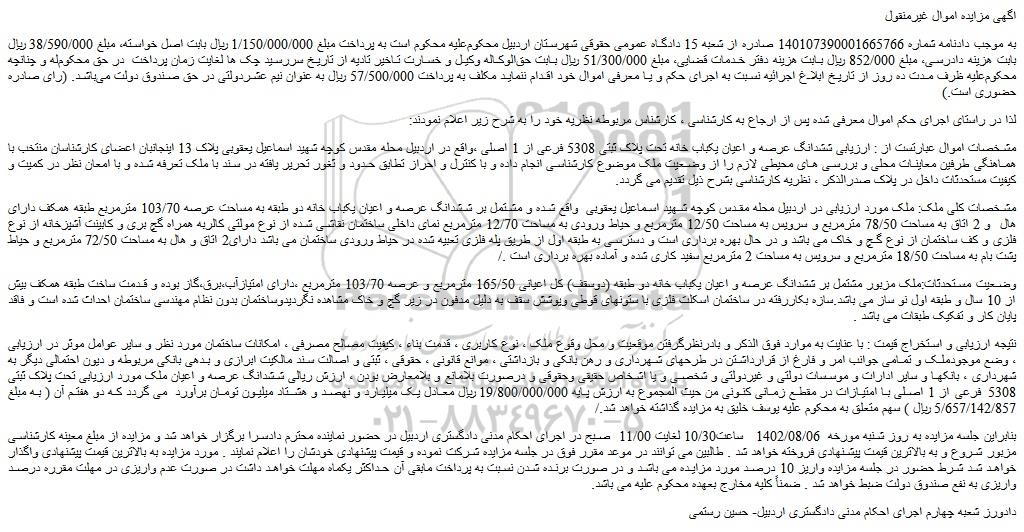 بنابراین جلسه مزایده به روز شنبه مورخه 1402/08/06 ساعت10/30 لغایت 11/00 صبح در اجرای احکام مدنی دادگستری اردبیل در حضور نماینده محترم دادسرا برگزار خواهد شد و مزایده از مبلغ معینه کارشناسی مزبور شروع و به بالاترین قیمت پیشنهادی فروخته خواهد شد . طالبین می توانند در موعد مقرر فوق در جلسه مزایده شرکت نموده و قیمت پیشنهادی خودشان را اعلام نمایند . مورد مزایده به بالاترین قیمت پیشنهادی واگذار خواهد شد شرط حضور در جلسه مزایده واریز 10 درصد مورد مزایده می باشد و در صورت برنده شدن نسبت به پرداخت مابقی آن حداکثر یکماه مهلت خواهد داشت در صورت عدم واریزی در مهلت مقرره درصد واریزی به نفع صندوق دولت ضبط خواهد شد . ضمناً کلیه مخارج بعهده محکوم علیه می باشد.