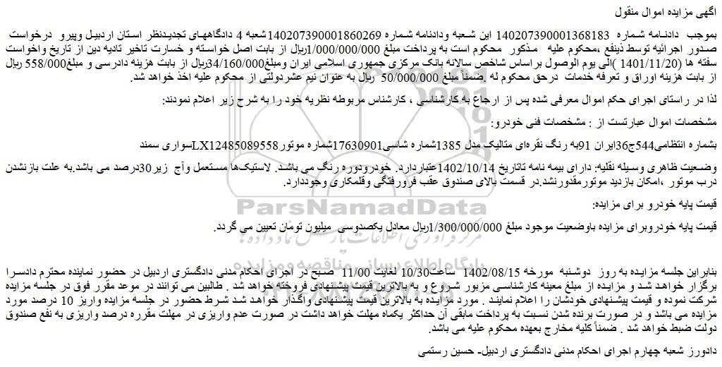 شعبه صادر کننده:شعبه چهارم اجرای احکام مدنی دادگستری شهرستان اردبیل