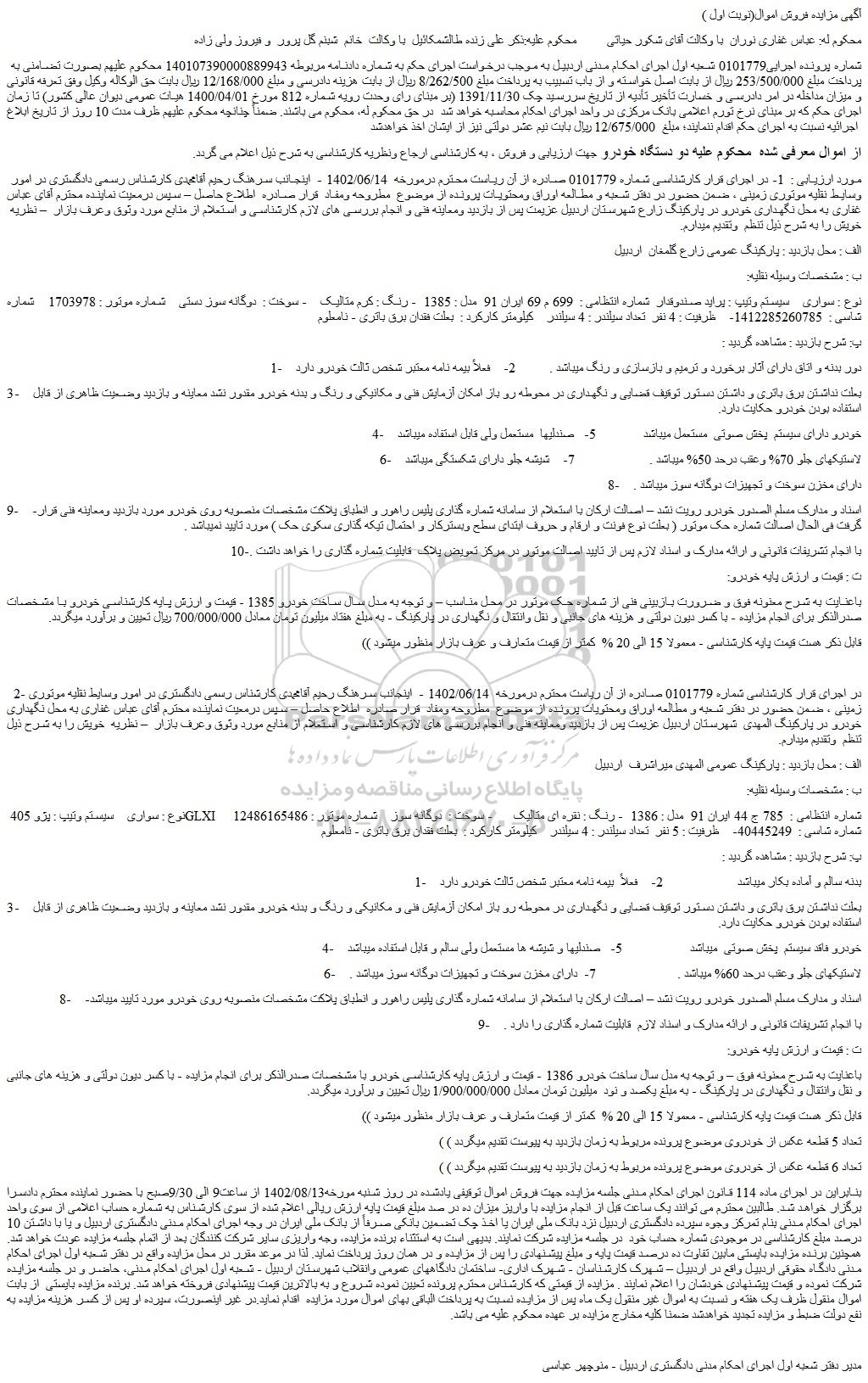 از اموال معرفی شده محکوم علیه دو دستگاه خودرو جهت ارزیابی و فروش ، به کارشناسی ارجاع ونظریه کارشناسی به شرح ذیل اعلام می گردد.