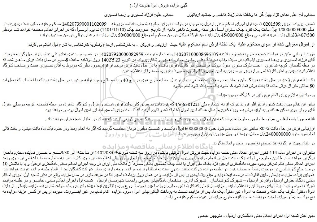بنابراین در اجرای ماده 114 قانون اجرای احکام مدنی جلسه مزایده جهت فروش اموال توقیفی یادشده در روز سه شنبه مورخه1402/08/09 از ساعت9 الی 9/30صبح با حضور نماینده محترم دادسرا برگزار خواهد شد. طالبین محترم می توانند یک ساعت قبل از انجام مزایده با واریز میزان ده در صد مبلغ قیمت پایه ارزش ریالی اعلام شده از سوی کارشناس به شماره حساب اعلامی از سوی واحد اجرای احکام مدنی بنام تمرکز وجوه سپرده دادگستری اردبیل نزد بانک ملی ایران یا اخذ چک تضمین بانکی صرفاً از بانک ملی ایران در وجه اجرای احکام مدنی دادگستری اردبیل و یا با داشتن 10 درصد مبلغ کارشناسی در موجودی شماره حساب خود در جلسه مزایده شرکت نمایند. بدیهی است به استثناء برنده مزایده، وجه واریزی سایر شرکت کنندگان بعد از اتمام جلسه مزایده عودت خواهد شد. همچنین برنده مزایده بایستی مابین تفاوت ده درصد قیمت پایه و مبلغ پیشنهادی را پس از مزایده و در همان روز پرداخت نماید. لذا در موعد مقرر در محل مزایده واقع در دفتر شعبه اول اجرای احکام مدنی دادگاه حقوقی اردبیل واقع در اردبیل – شهرک کارشناسان - شهرک اداری- ساختمان دادگاههای عمومی وانقلاب شهرستان اردبیل - شعبه اول اجرای احکام مدنی، حاضر و در جلسه مزایده شرکت نموده و قیمت پیشنهادی خودشان را اعلام نمایند . مزایده از قیمتی که کارشناس محترم پرونده تعیین نموده شروع و به بالاترین قیمت پیشنهادی فروخته خواهد شد. برنده مزایده بایستی از بابت اموال منقول ظرف یک هفته و نسبت به اموال غیر منقول یک ماه پس از مزایده نسبت به پرداخت الباقی بهای اموال مورد مزایده اقدام نماید.در غیر اینصورت، سپرده او پس از کسر هزینه مزایده به نفع دولت ضبط و مزایده تجدید خواهدشد ضمنا کلیه مخارج مزایده بر عهده محکوم علیه می باشد.