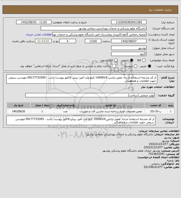 شرح کلی نیاز: از کد مشابه استفاده شده- تعمیر ترانس 1000KVA کیلو ولت آمپر- پیش فاکتور پیوست باشد - 09177733393 مهندس سیفی جهت اطلاعات و هماهنگی