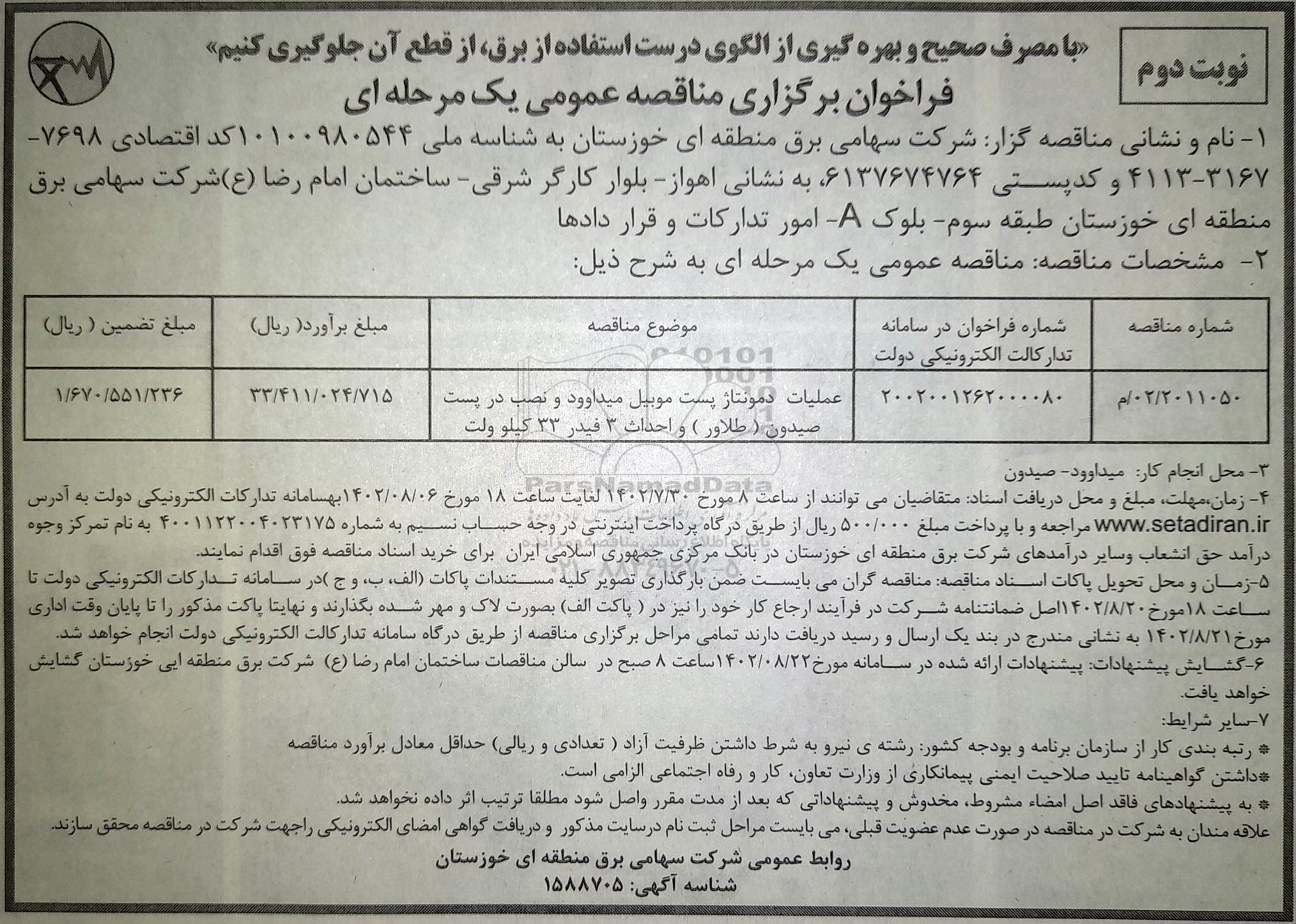 02/2011050/م    2002001262000080 عملیات دمونتاژ پست موبیل میداوود و نصب در پست صیدون (طلاور) و احداث 3 فیدر 33 کیلوولت 33.411.024.715 1.670.551.236