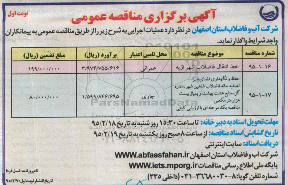 شرکت آب و فاضلاب استان اصفهان در نظر دارد عملیات اجرایی به شرح زیر را از طریق مناقصه عمومی به پیمانکاران واجد شرایط واگذار نماید .