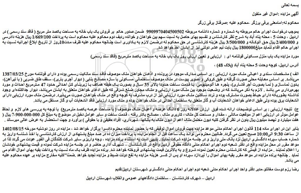 بموجب درخواست اجرای حکم مربوطه به شماره و شماره دادنامه مربوطه 9909970404500502 ضمن صدور حکم بر فروش یک باب خانه به مساحت یکصد متر مربع ( فاقد سند رسمی ) در اردبیل ، وحدت 5 ، محله پناه آباد به شرح نظر کارشناس و تقسیم بهای حاصل به نسبت سهم بین خواهان و خوانده ردیف دوم محکوم علیه محکوم است به پرداخت 1/669/100 ریال هزینه دادرسی و 2/400/000 ریال حق الوکاله و 3/500/000 ریال هزینه کارشناسی در حق محکوم له درضمن لازم به یاداوری است چنانچه محکوم علیه ظرف مدت10روز از تاریخ ابلاغ اجرائیه نسبت به اجرای حکم اقدام ننماید مبلغ1800000 ریال بابت نیم عشر دولتی نیز از ایشان اخذ خواهد شد.