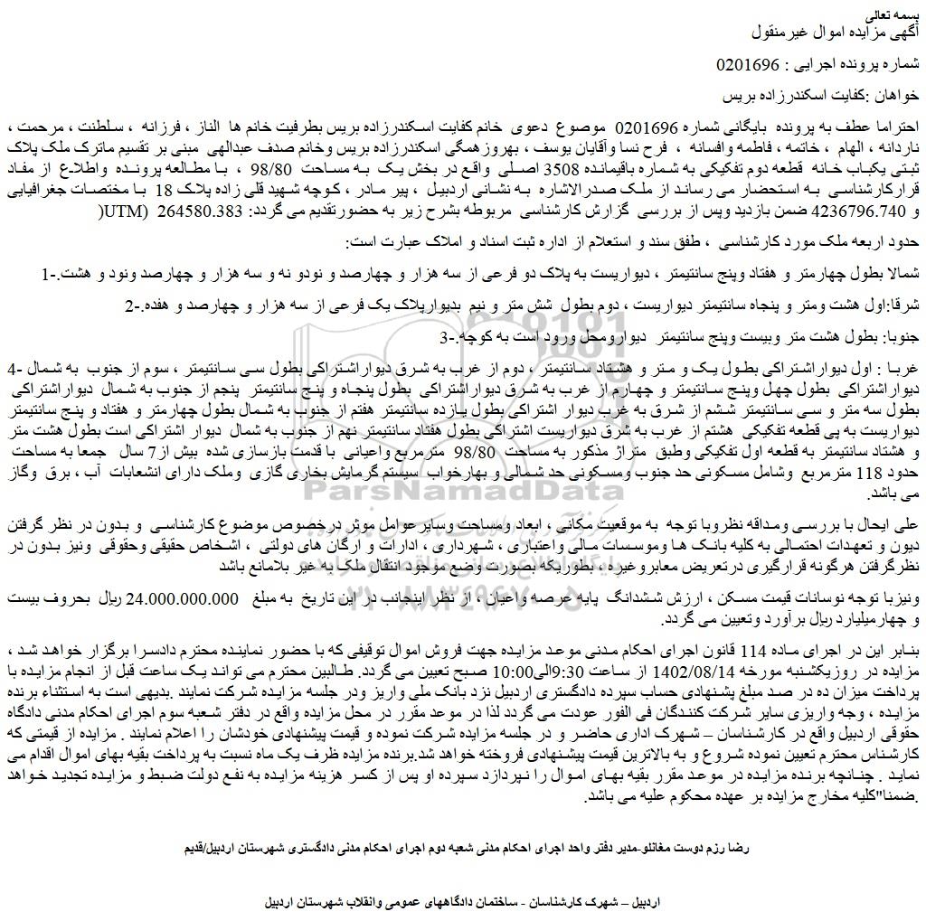 احتراما عطف به پرونده بایگانی شماره 0201696 موصوع دعوی خانم کفایت اسکندرزاده بریس بطرفیت خانم ها الناز ، فرزانه ، سلطنت ، مرحمت ، ناردانه ، الهام ، خاتمه ، فاطمه وافسانه ، فرح نسا وآقایان یوسف ، بهروزهمگی اسکندرزاده بریس وخانم صدف عبدالهی مبنی بر تقسیم ماترک ملک پلاک ثبتی یکباب خانه قطعه دوم تفکیکی به شماره باقیمانده 3508 اصلی واقع در بخش یک به مساحت 98/80 ، با مطالعه پرونده واطلاع از مفاد قرارکارشناسی به استحضار می رساند از ملک صدرالاشاره به نشانی اردبیل ، پیر مادر ، کوچه شهید قلی زاده پلاک 18 با مختصات جغرافیایی (UTM) 264580.383 و 4236796.740 ضمن بازدید وپس از بررسی گزارش کارشناسی مربوطه بشرح زیر به حضورتقدیم می گردد: