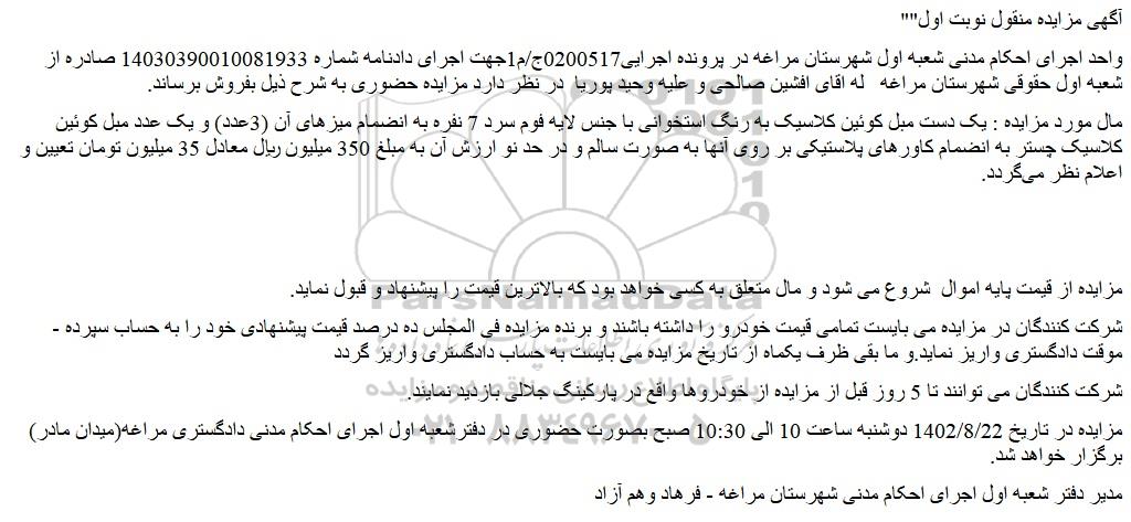 مزایده در تاریخ 1402/8/22 دوشنبه ساعت 10 الی 10:30 صبح بصورت حضوری در دفترشعبه اول اجرای احکام مدنی دادگستری مراغه(میدان مادر) برگزار خواهد شد.