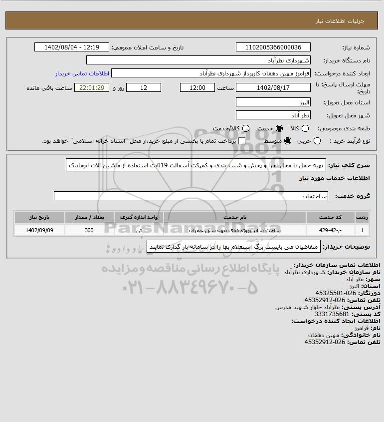 استعلام تهیه حمل تا محل اجرا و پخش و شیب بندی و کمپکت آسفالت 019بت اسنفاده از ماشین الات اتوماتیک, استعلام تهیه حمل تا محل اجرا و پخش و شیب بندی و کمپکت آسفالت 019بت اسنفاده از ماشین الات اتوماتیک