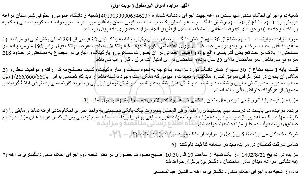 شعبه دوم اجرای احکام مدنی شهرستان مراغه جهت اجرای دادنامه شماره 140130390006546237شعبه 3 دادگاه عمومی و حقوقی شهرستان مراغه درنظردارد 1سهم مشاع از 30 سهم ازشش دانگ عرصه و اعیان یک باب خانه مسکونی متعلق به آقای حبیب درخت بربخواسته محکومیت مدنی (حکم به پرداخت وجه نقد ) درحق آقای محمدرضا دمقانی با مشخصات ذیل ازطریق انجام مزایده حضوری به فروش برساند: