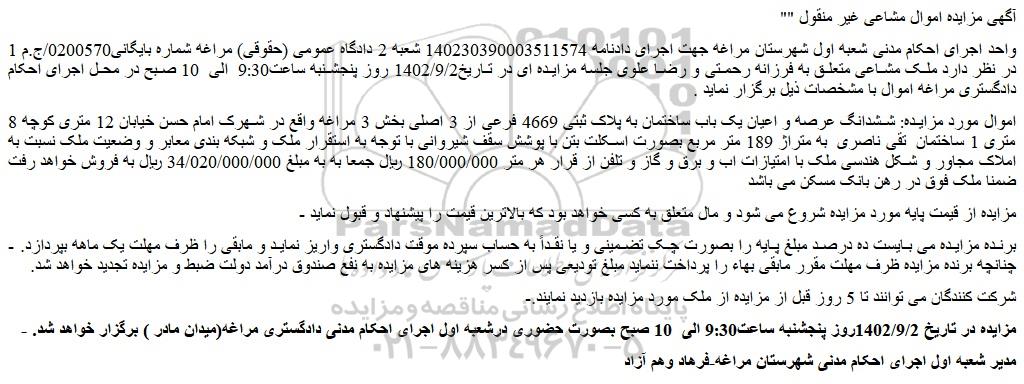 واحد اجرای احکام مدنی شعبه اول شهرستان مراغه جهت اجرای دادنامه 140230390003511574 شعبه 2 دادگاه عمومی (حقوقی) مراغه شماره بایگانی0200570/ج.م 1 در نظر دارد ملک مشاعی متعلق به فرزانه رحمتی و رضا علوی جلسه مزایده ای در تاریخ1402/9/2 روز پنجشنبه ساعت9:30 الی  10 صبح در محل اجرای احکام دادگستری مراغه اموال با مشخصات ذیل برگزار نماید .