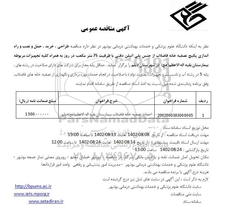 نظر به اینكه دانشگاه علوم پزشكی و خدمات بهداشتی درمانی بوشهر در نظر دارد مناقصه طراحی، خرید، حمل و نصب و راه اندازی پکیج تصفیه خانه فاضلاب از جنس پلی اتیلن دفنی با ظرفیت 75 مترمکعب در روز به همراه کلیه تجهیزات مربوطه بیمارستان بقیه اله الاعظم (عج) در شهرستان دیلم را برگزار نماید. حداقل پایه مجاز برای شرکت های دارای صلاحیت در رشته های: پایه 5 در رشته آب و تاسیسات و تجهیزات (بصورت توام) با صلاحیت در انجام خدمات بهره برداری و نگهداری از تصفیه خانه های فاضلاب، وفق برنامه زمانبندی شده ذیل نسبت به اخذ اسناد مناقصه از طریق سامانه اقدام نمایند.