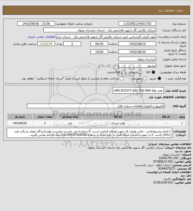 نام دستگاه خریدار:شرکت پالایش گاز شهید هاشمی نژاد استان خراسان رضوی