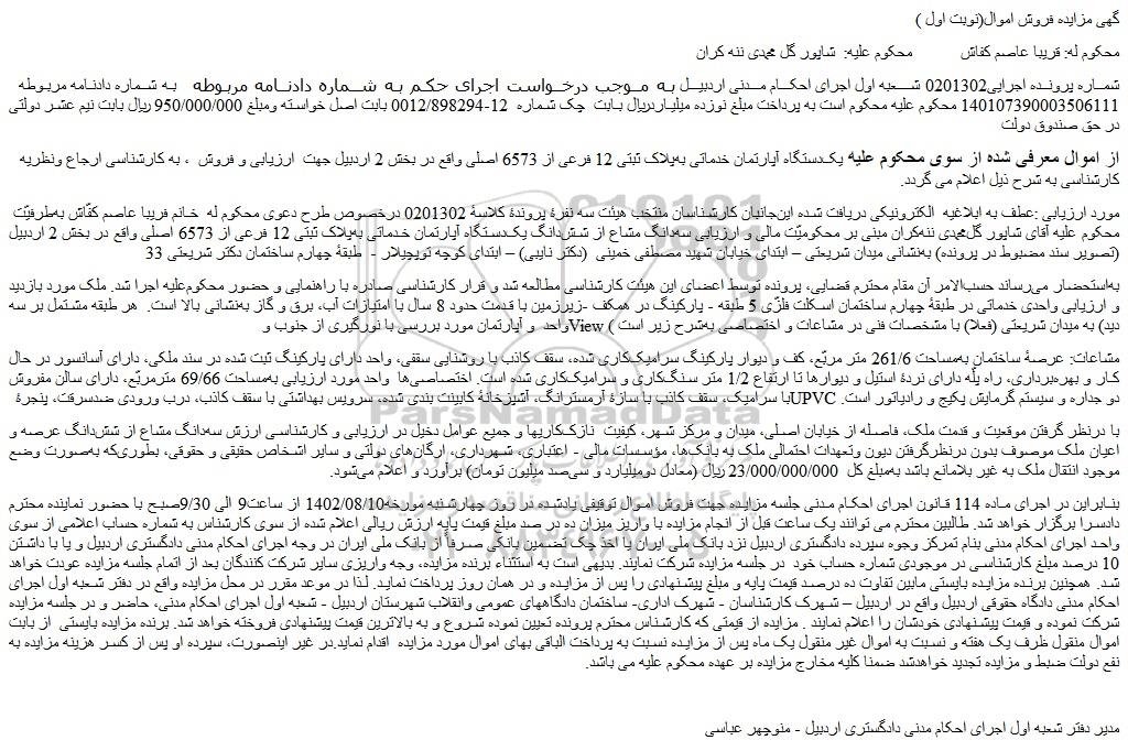 از اموال معرفی شده از سوی محکوم علیه یک دستگاه آپارتمان خدماتی به پلاک ثبتی 12 فرعی از 6573 اصلی واقع در بخش 2 اردبیل جهت ارزیابی و فروش ، به کارشناسی ارجاع ونظریه کارشناسی به شرح ذیل اعلام می گردد.