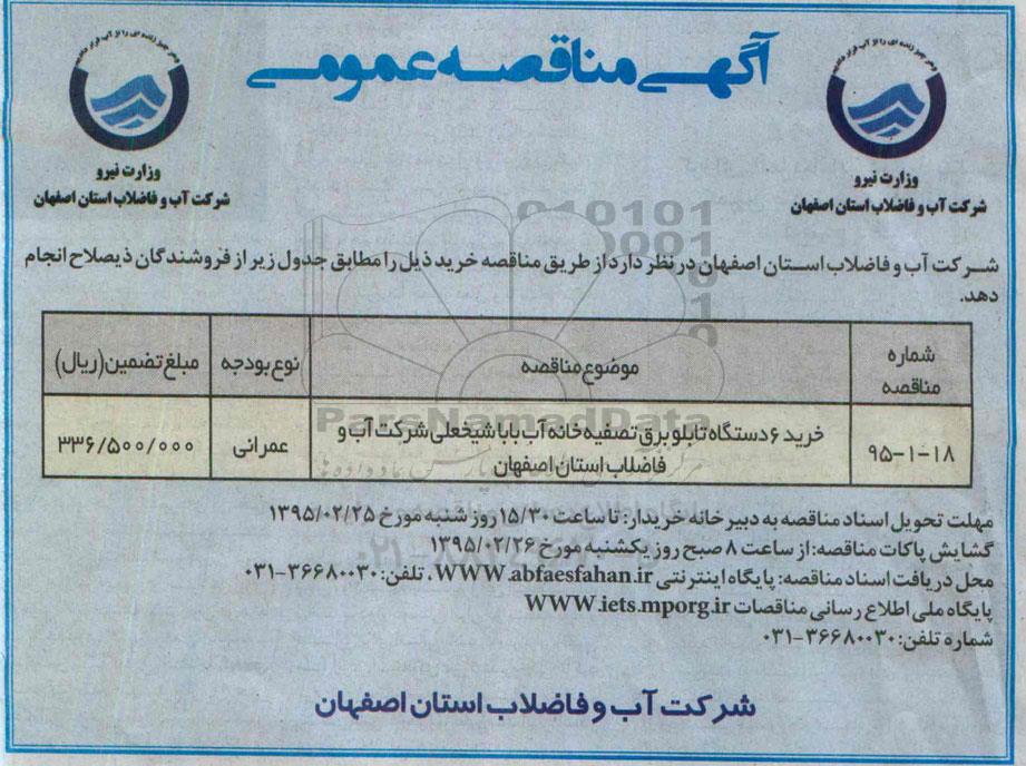شرکت آب و فاضلاب استان اصفهان در نظر دارد از طریق مناقصه خریدهای ذیل را مطابق جدول زیر را از فروشندگان ذیصلاح انجام دهد.