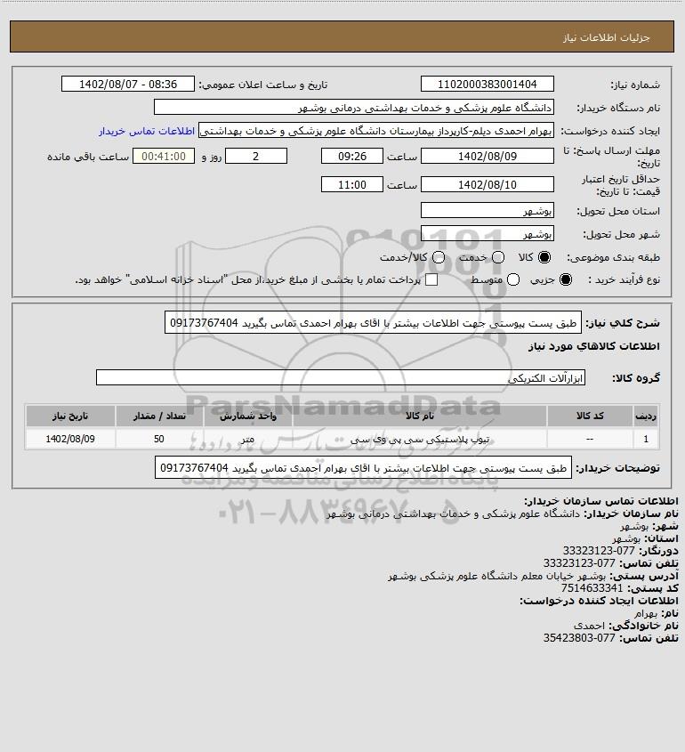 شرح کلی نیاز: طبق یست پیوستی جهت اطلاعات بیشتر با اقای بهرام احمدی تماس بگیرید 09173767404