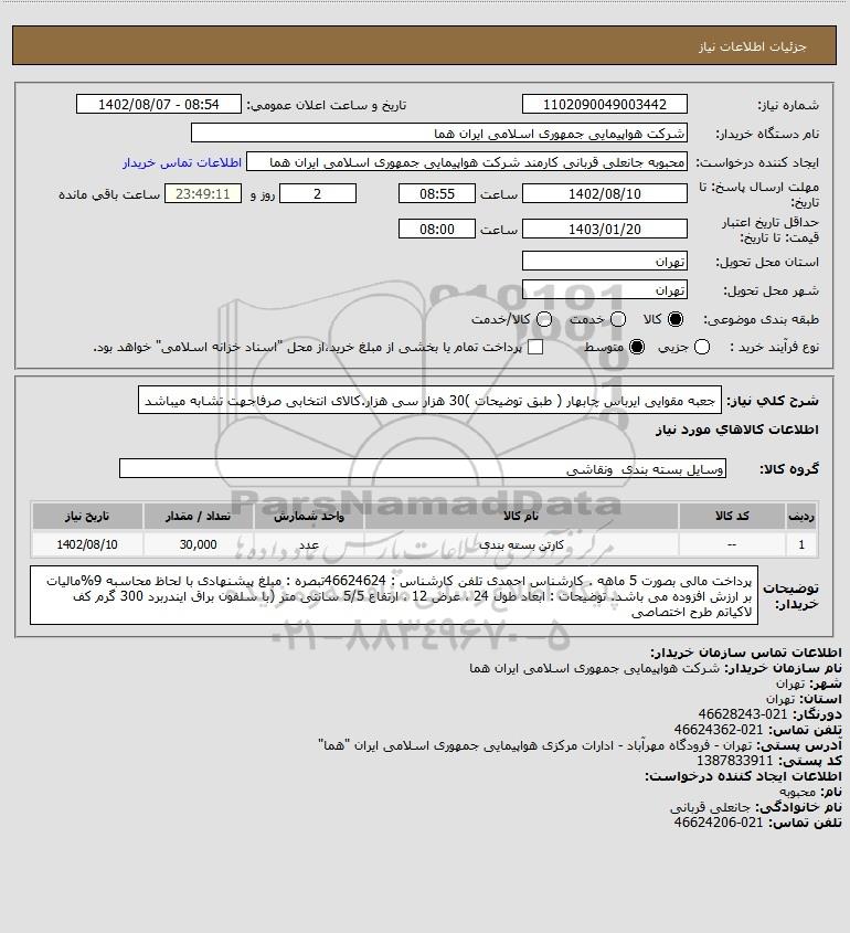 شرح کلی نیاز: جعبه مقوایی ایرباس چابهار ( طبق توضیحات )30 هزار سی هزار.کالای انتخابی صرفاجهت تشابه میباشد