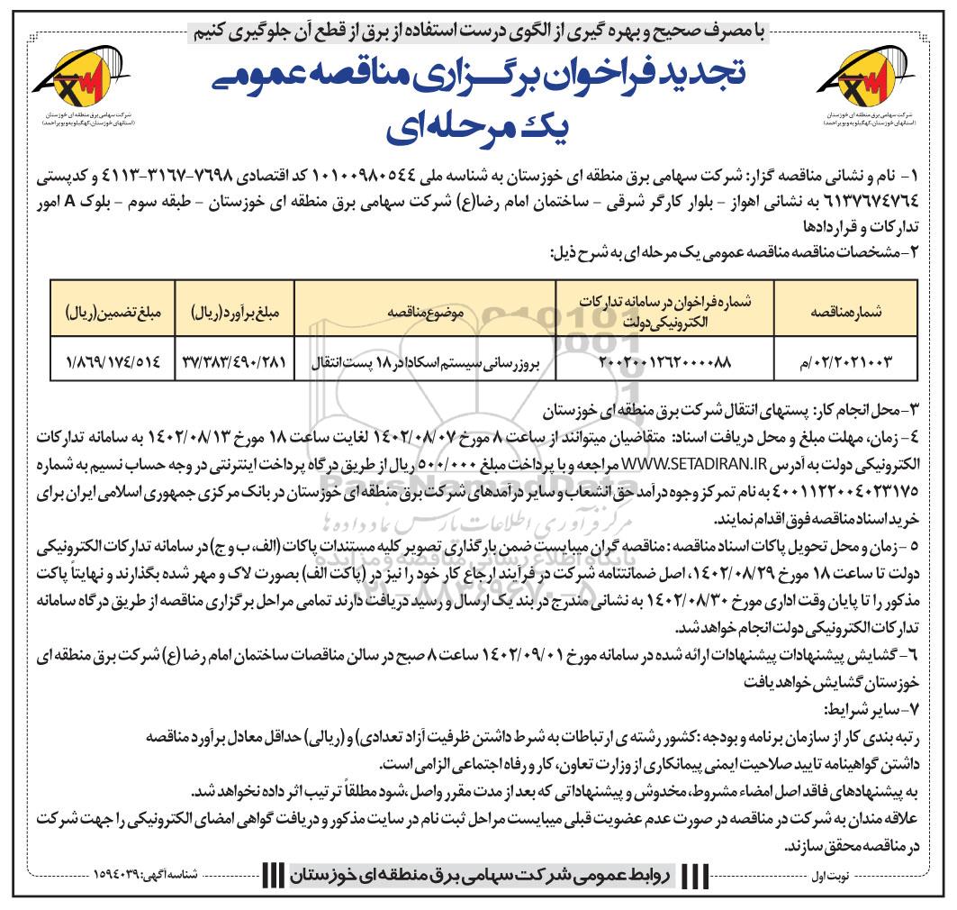 تجدید مناقصه عمومی بروزرسانی سیستم اسکادا در 18 پست انتقال, تجدید مناقصه عمومی بروزرسانی سیستم اسکادا در 18 پست انتقال