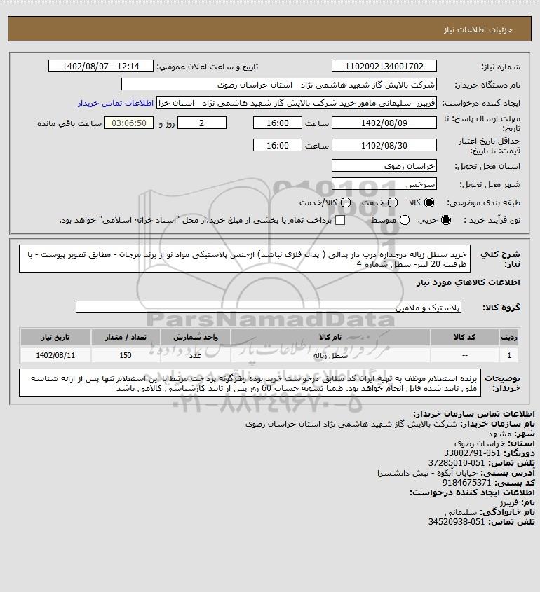 نام دستگاه خریدار:شرکت پالایش گاز شهید هاشمی نژاد استان خراسان رضوی