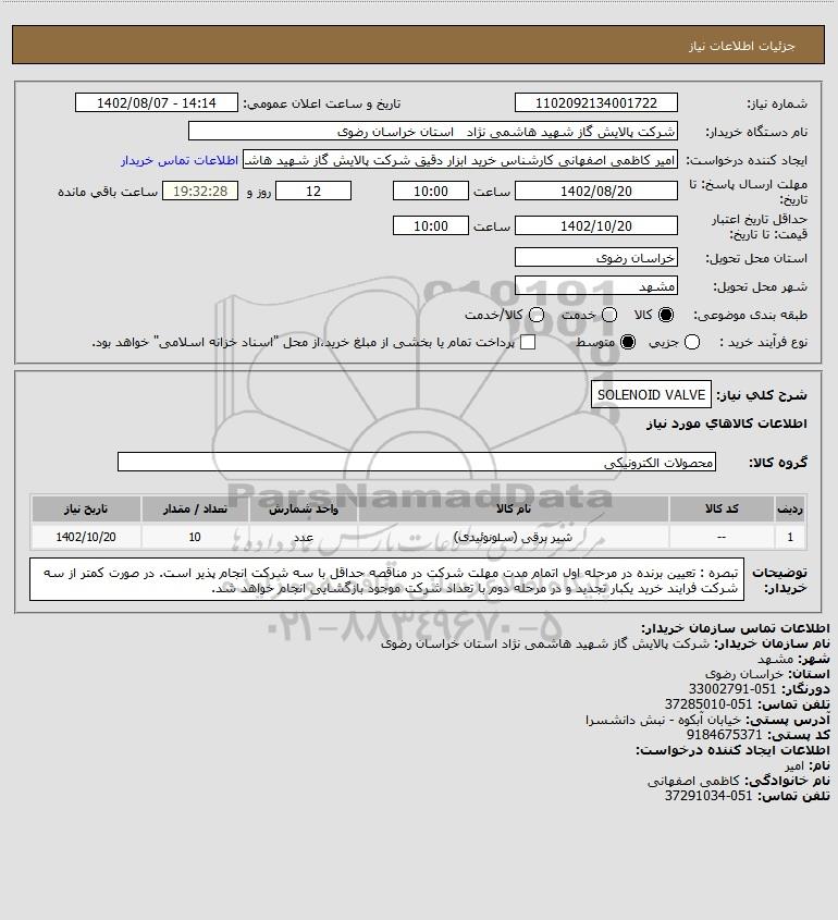 | 1 | -- | شیر برقی (سلونوئیدی) | عدد | 10 | 1402/10/20 |