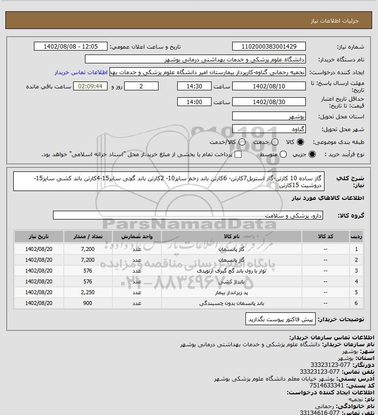 شرح کلی نیاز: گاز ساده 10 کارتن-گاز استریل7کارتن- 6کارتن باند زخم سایز10- 2کارتن باند گچی سایز15-4کارتن باند کشی سایز15- دروشیت 15کارتن