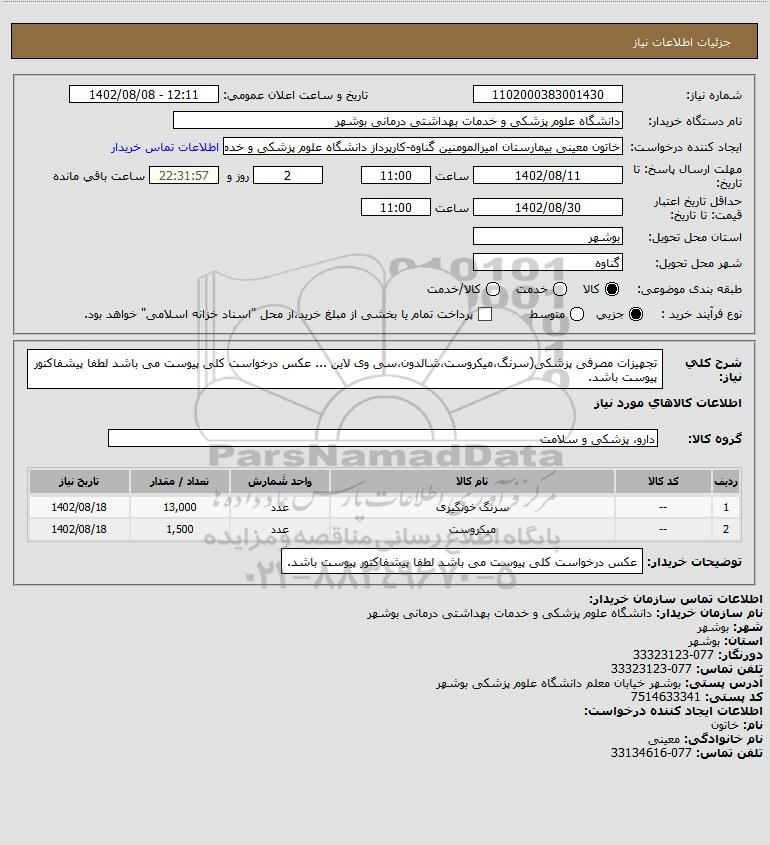 | 1 | -- | سرنگ خونگیری | عدد | 13,000 | 1402/08/18 |
