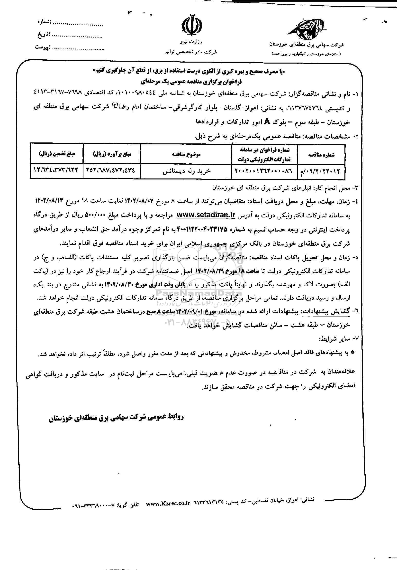 1. نام و نشانی مناقصه گزار: شرکت سهامی برق منطقه ای خوزستان به شناسه ملی 10100980544 کداقتصادی 7698-3167-4113 و کدپستی 6137674764 به نشانی اهواز، گلستان، بلوار کارگر شرقی، ساختمان امام رضا ع  شرکت سهامی برق منطقه ای خوزستان، طبقه سوم، بلوک A امور تدارکات و قراردادها