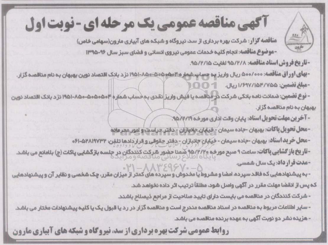 مناقصه گزار : شرکت بهره برداری از سد نیروگاه و شبکه های آبیاری مارون (سهامی خاص)