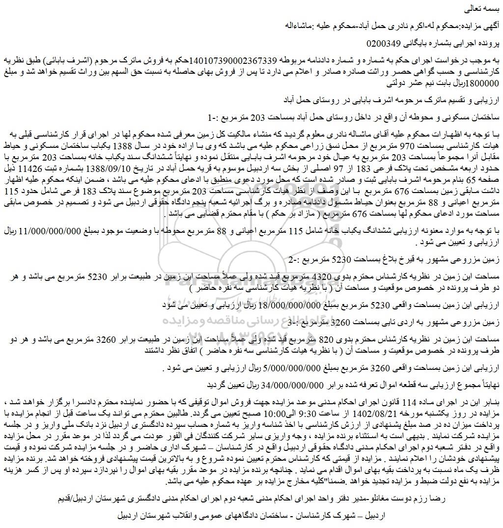 به موجب درخواست اجرای حکم به شماره و شماره دادنامه مربوطه 140107390002367339حکم به فروش ماترک مرحوم (اشرف بابائی) طبق نظریه کارشناسی و حسب گواهی حصر وراثت صادره صادر و اعلام می دارد تا پس از فروش بهای حاصله به نسبت حق السهم بین وراث تقسیم خواهد شد و مبلغ 1800000ریال بابت نیم عشر دولتی