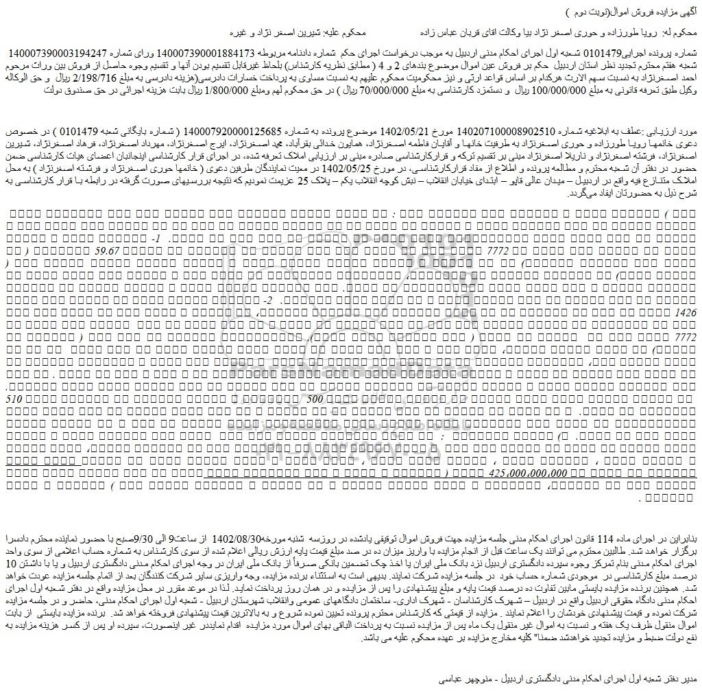 شماره پرونده اجرایی0101479 شعبه اول اجرای احکام مدنی اردبیل به موجب درخواست اجرای حکم شماره دادنامه مربوطه 140007390001884173 ورای شماره 140007390003194247 شعبه هفتم محترم تجدید نظر استان اردبیل حکم بر فروش عین اموال موضوع بندهای 2 و 4 ( مطابق نظریه کارشناس) بلحاظ غیرقابل تقسیم بودن آنها و تقسیم وجوه حاصل از فروش بین وراث مرحوم احمد اصغرنژاد به نسبت سهم الارث هرکدام بر اساس قواعد ارثی و نیز محکومیت محکوم علیهم به نسبت مساوی به پرداخت خسارات دادرسی(هزینه دادرسی به مبلغ 2/198/716 ریال و حق الوکاله وکیل طبق تعرفه قانونی به مبلغ 100/000/000 ریال و دستمزد کارشناسی به مبلغ 70/000/000 ریال ) در حق محکوم لهم ومبلغ 1/800/000 ریال بابت هزینه اجرائی در حق صندوق دولت