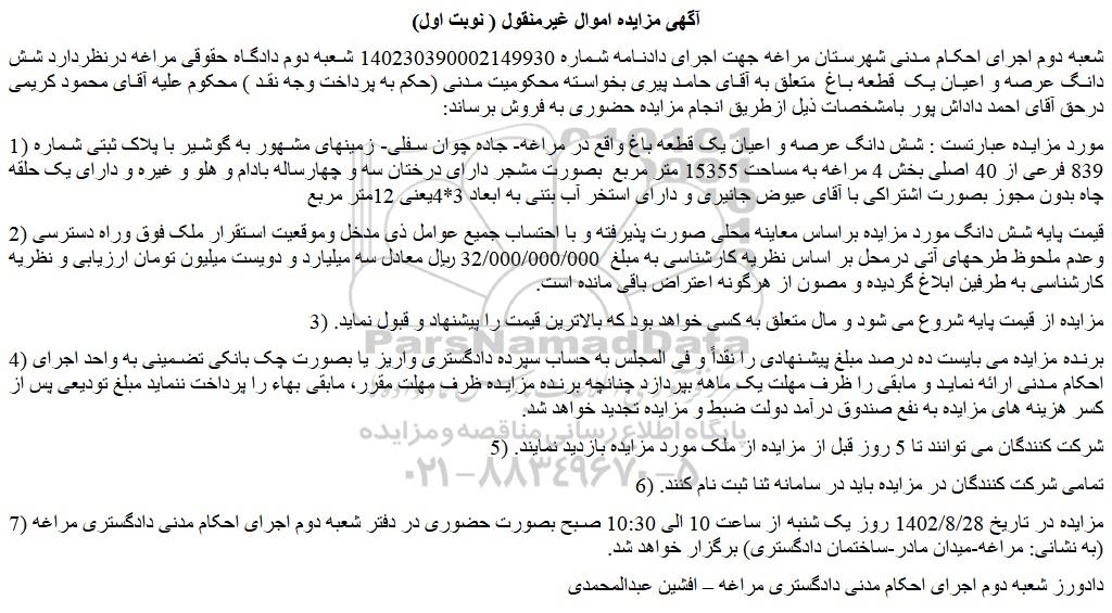 1) مورد مزایده عبارتست : شش دانگ عرصه و اعیان یک قطعه باغ واقع در مراغه- جاده چوان سفلی- زمینهای مشهور به گوشیر با پلاک ثبتی شماره 839 فرعی از 40 اصلی بخش 4 مراغه به مساحت 15355 متر مربع بصورت مشجر دارای درختان سه و چهارساله بادام و هلو و غیره و دارای یک حلقه چاه بدون مجوز بصورت اشتراکی با آقای عیوض جانیری و دارای استخر آب بتنی به ابعاد 3*4یعنی 12متر مربع