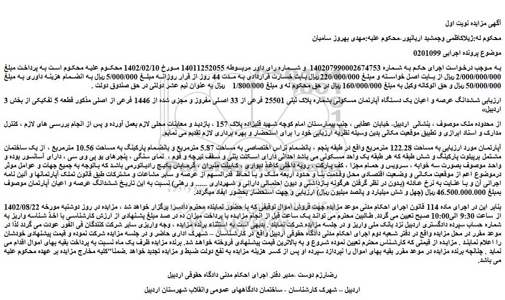 بنابر این در اجرای ماده 114 قانون اجرای احکام مدنی موعد مزایده جهت فروش اموال توقیفی که با حضور نماینده محترم دادسرا برگزار خواهد شد ، مزایده در روز دوشنبه مورخه 1402/08/22 از ساعت 9:30 الی10:00 صبح تعیین می گردد. طالبین محترم می تواند یک ساعت قبل از انجام مزایده با پرداخت میزان ده در صد مبلغ پشنهادی از ارزش کارشناسی با اخذ شناسه واریز به شماره حساب سپرده دادگستری اردبیل نزد بانک ملی واریز و در جلسه مزایده شرکت نمایند . بدیهی است به استثناء برنده مزایده ، وجه واریزی سایر شرکت کنندگان فی الفور عودت می گردد لذا در موعد مقرر در محل مزایده واقع در دفتر شعبه دوم اجرای احکام مدنی دادگاه حقوقی اردبیل واقع در کارشناسان – شهرک اداری حاضر و در جلسه مزایده شرکت نموده و قیمت پیشنهادی خودشان را اعلام نمایند . مزایده از قیمتی که کارشناس محترم تعیین نموده شروع و به بالاترین قیمت پیشنهادی فروخته خواهد شد. برنده مزایده ظرف یک ماه نسبت به پرداخت بقیه بهای اموال اقدام می نماید . چنانچه برنده مزایده در موعد مقرر بقیه بهای اموال را نپردازد سپرده او پس از کسر هزینه مزایده به نفع دولت ضبط و مزایده تجدید خواهد .ضمنا"کلیه مخارج مزایده بر عهده محکوم علیه می باشد.