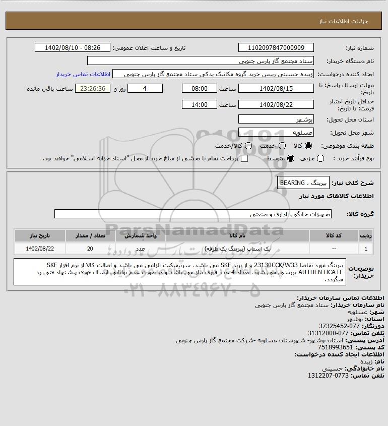 توضیحات خریدار:بیرینگ مورد تقاضا 23130CCK/W33 و از برند SKF می باشد، سرتیفیکیت الزامی می باشد و اصالت کالا از نرم افزار SKF AUTHENTICATE بررسی می شود، تعداد 4 عدد فوری نیاز می باشد و در صورت عدم توانایی ارسال فوری پیشنهاد فنی رد میگردد.