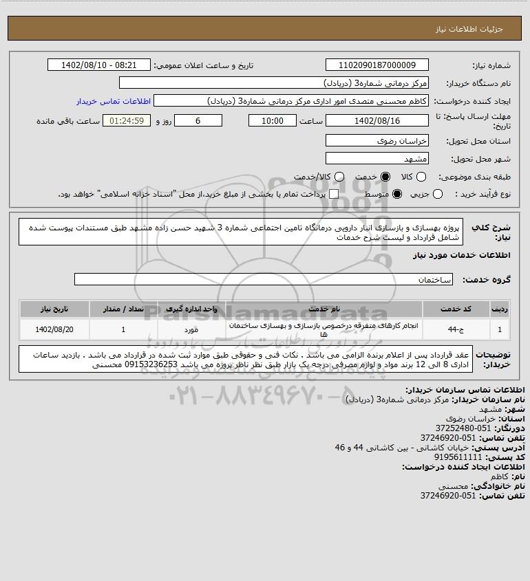 شرح کلی نیاز: پروژه بهسازی و بازسازی انبار دارویی درمانگاه تامین اجتماعی شماره 3 شهید حسن زاده مشهد طبق مستندات پیوست شده شامل قرارداد و لیست شرح خدمات