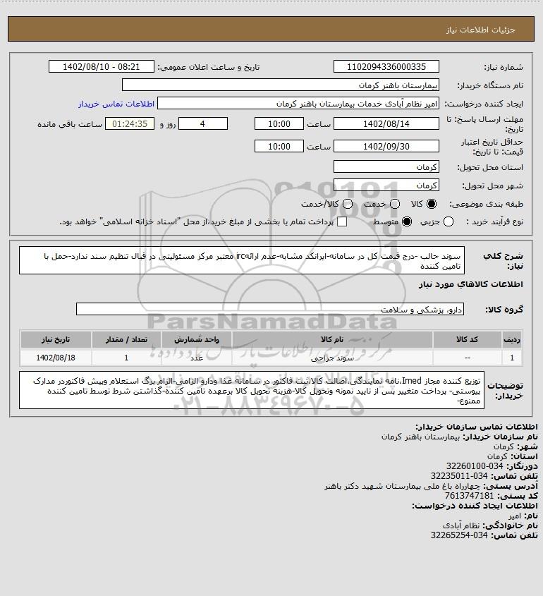 نام دستگاه خریدار:بیمارستان باهنر کرمان