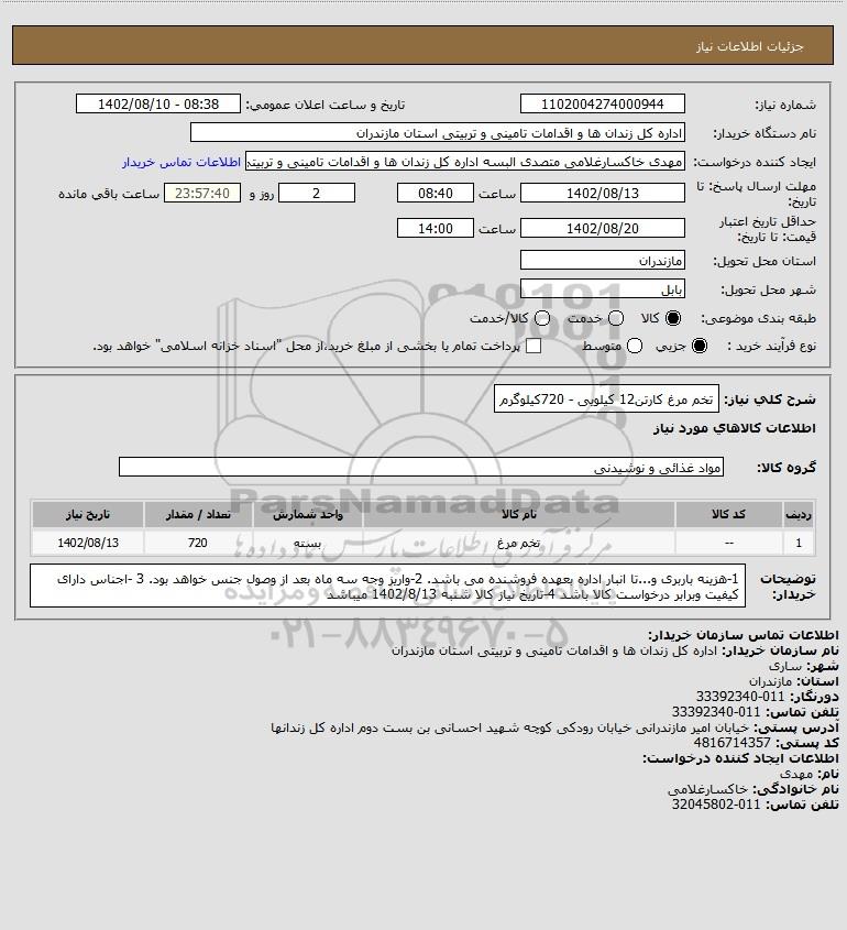 شرح کلی نیاز: تخم مرغ کارتن12 کیلویی - 720کیلوگرم
