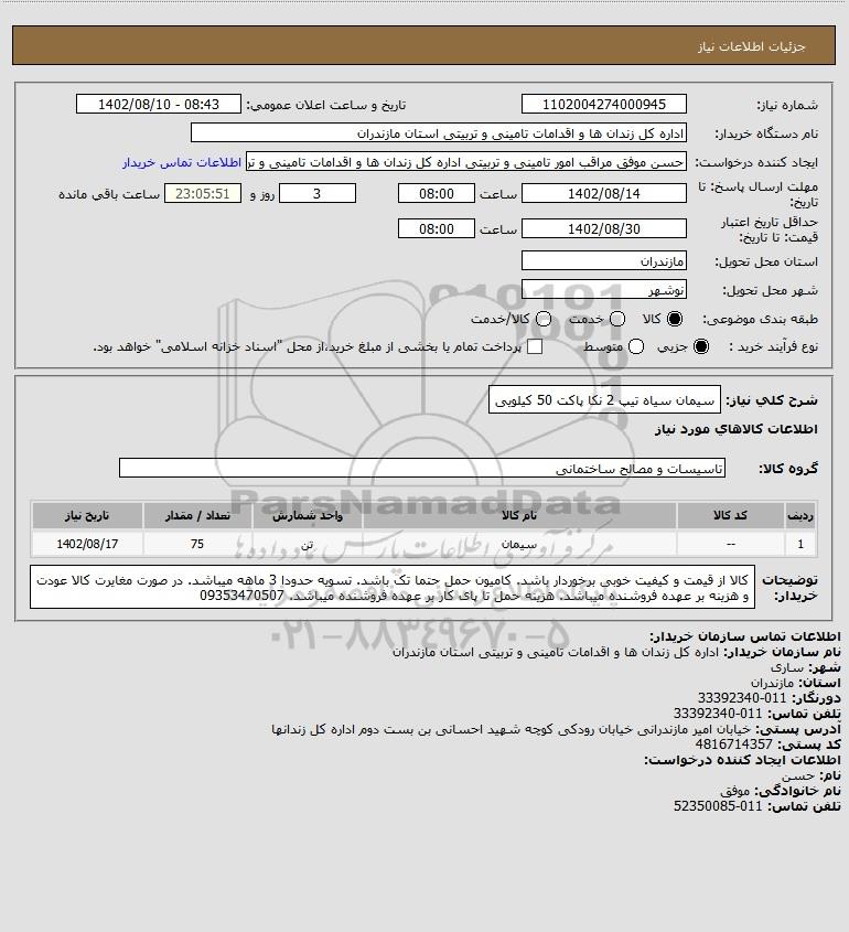 شرح کلی نیاز: سیمان سیاه تیپ 2 نکا پاکت 50 کیلویی