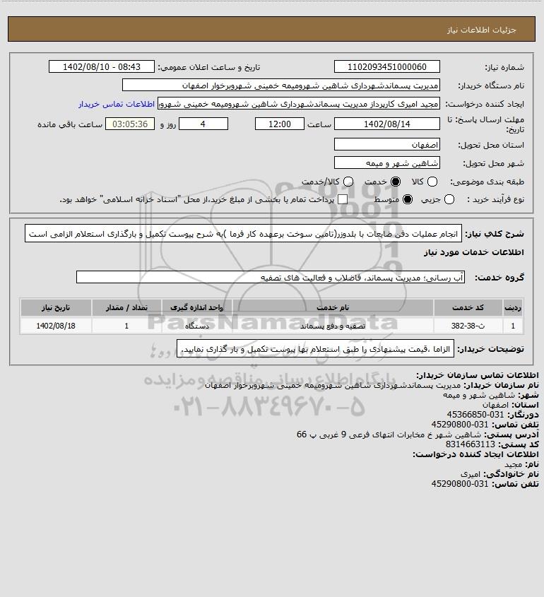شرح کلی نیاز: انجام عملیات دفن ضایعات با بلدوزر(تامین سوخت برعهده کار فرما )به شرح پیوست تکمیل و بارگذاری استعلام الزامی است