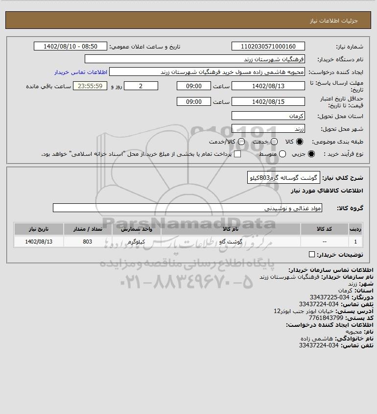 شرح کلی نیاز: گوشت گوساله گرم803کیلو