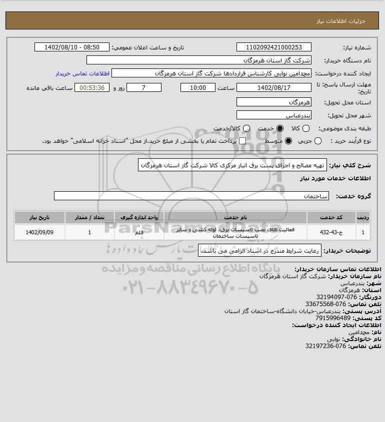 شرح کلی نیاز: تهیه مصالح و اجرای پست برق انبار مرکزی کالا شرکت گاز استان هرمزگان