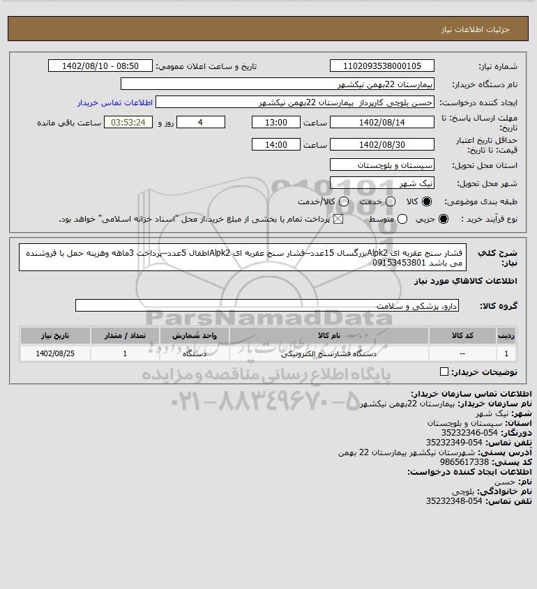 | 1 | -- | دستگاه فشارسنج الکترونیکی | دستگاه | 1 | 1402/08/25 |