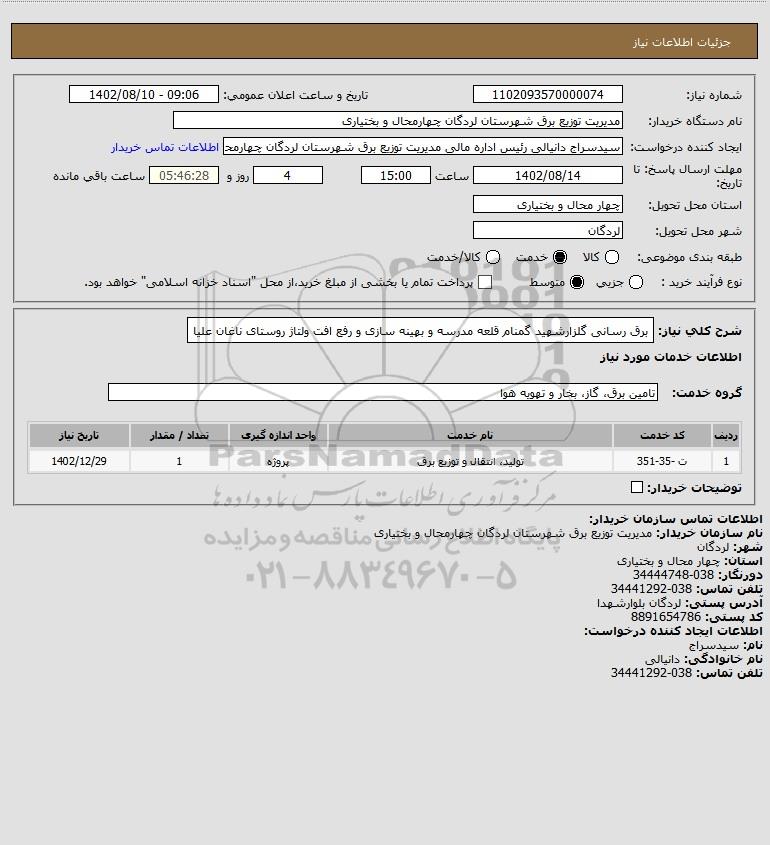 نام دستگاه خریدار:مدیریت توزیع برق شهرستان لردگان چهارمحال و بختیاری