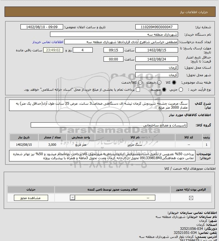شرح کلی نیاز: سنگ مرمریت چشمه شیردوش کرمان تیشه ای دستگاهی ضخامت3 سانت، عرض 35 سانت طول آزاد(حداقل یک متر) به مقدار 3000 متر مربع
