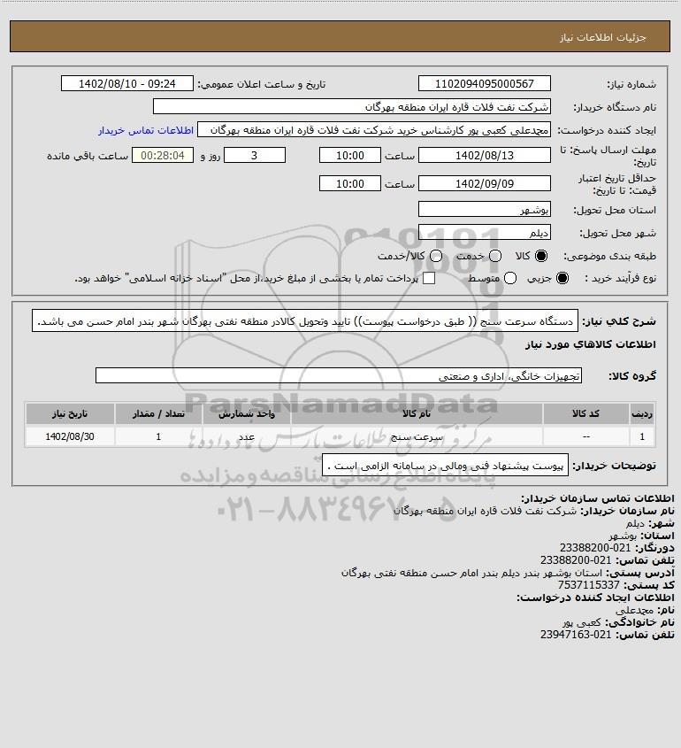 شرح کلی نیاز: دستگاه سرعت سنج (( طبق درخواست پیوست))