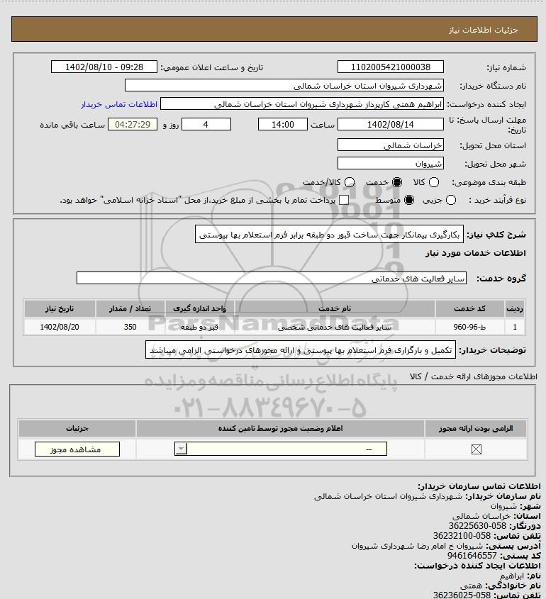 شرح کلی نیاز: بکارگیری پیمانکار جهت ساخت قبور دو طبقه برابر فرم استعلام بها پیوستی
