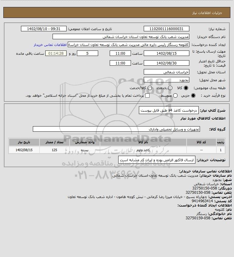شرح کلی نیاز: درخواست کاغذ a4 طبق فایل پیوست