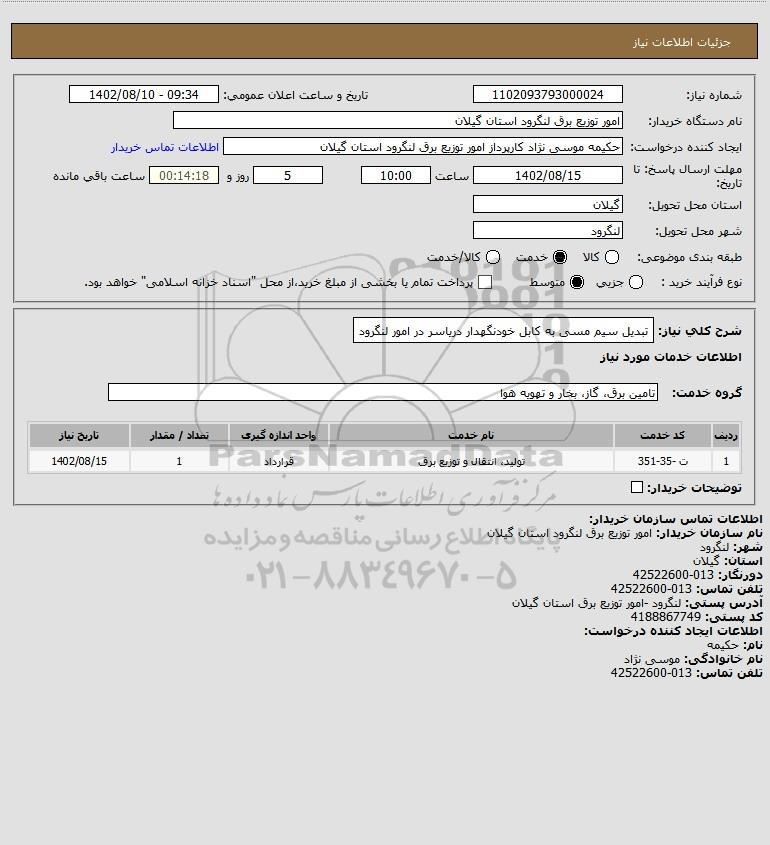 شرح کلی نیاز: تبدیل سیم مسی به کابل خودنگهدار دریاسر در امور لنگرود