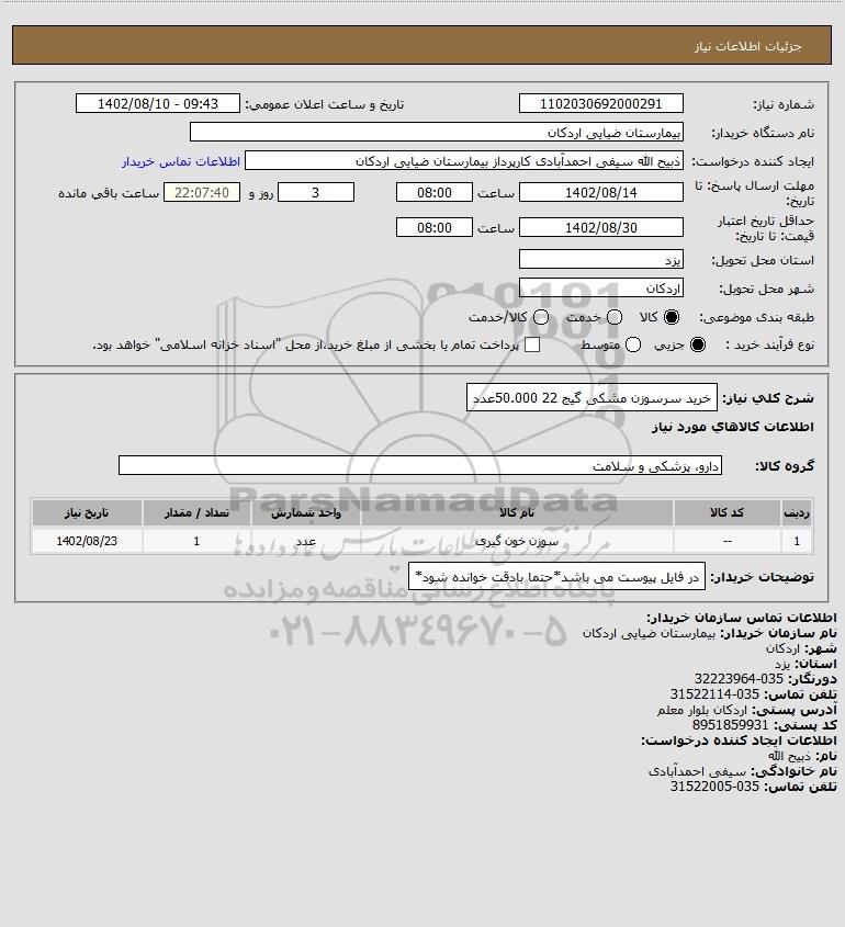 شرح کلی نیاز: خرید سرسوزن مشکی گیج 22 50.000عدد